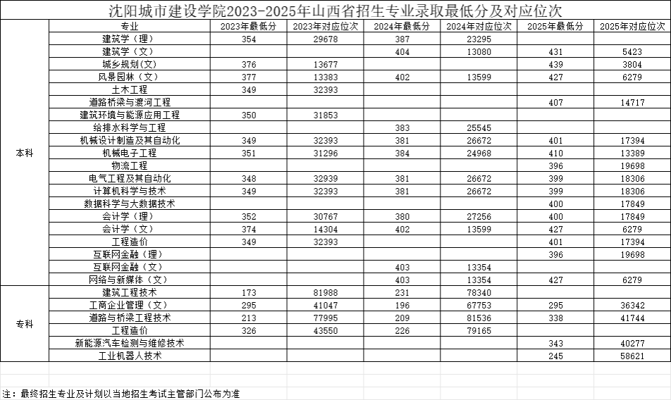 山西2023-2025年招生专业录取最低分数线及对应位次