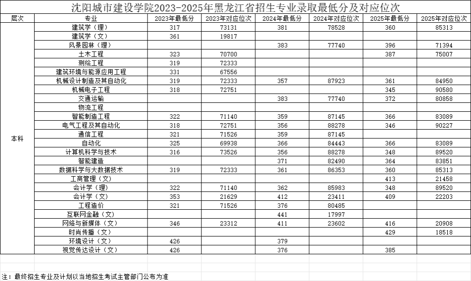 黑龙江2023-2025年招生专业录取最低分数线及对应位次