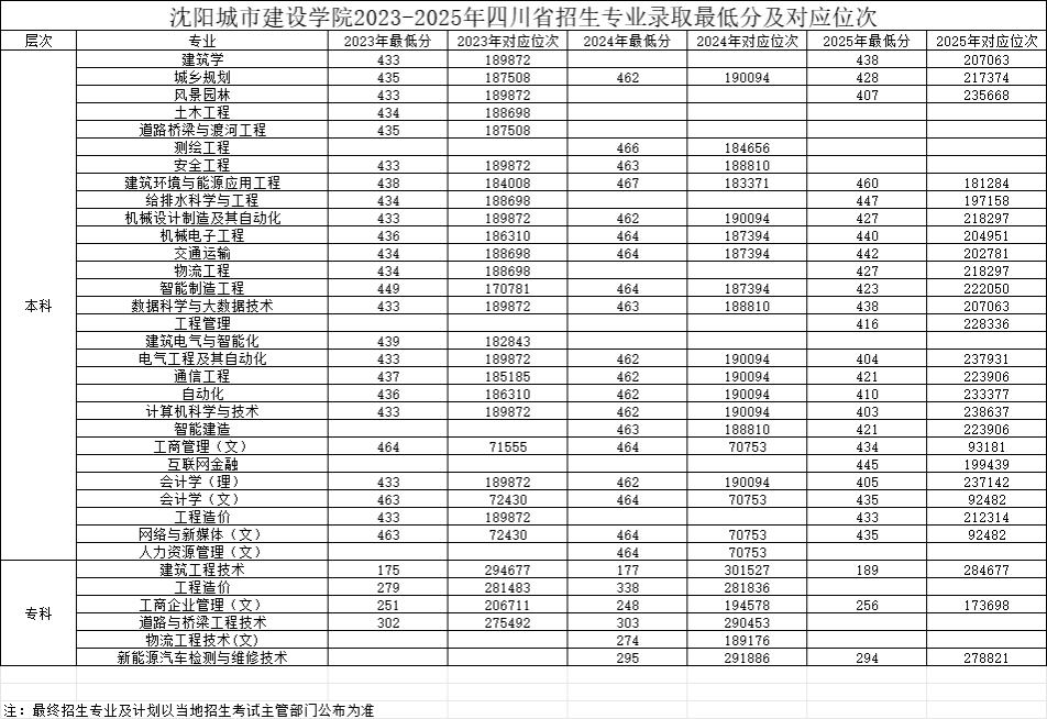 四川2023-2025年招生专业录取最低分数线及对应位次