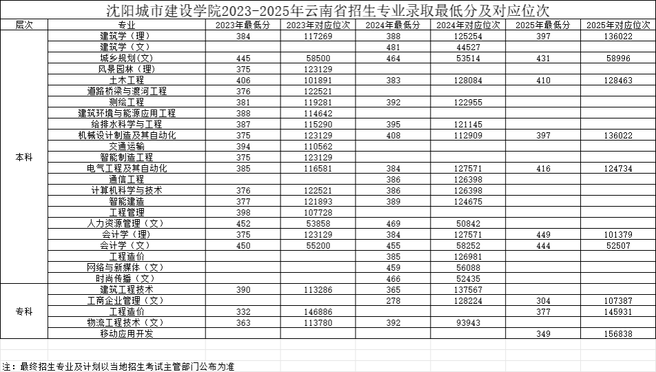 云南2023-2025年招生专业录取最低分数线及对应位次